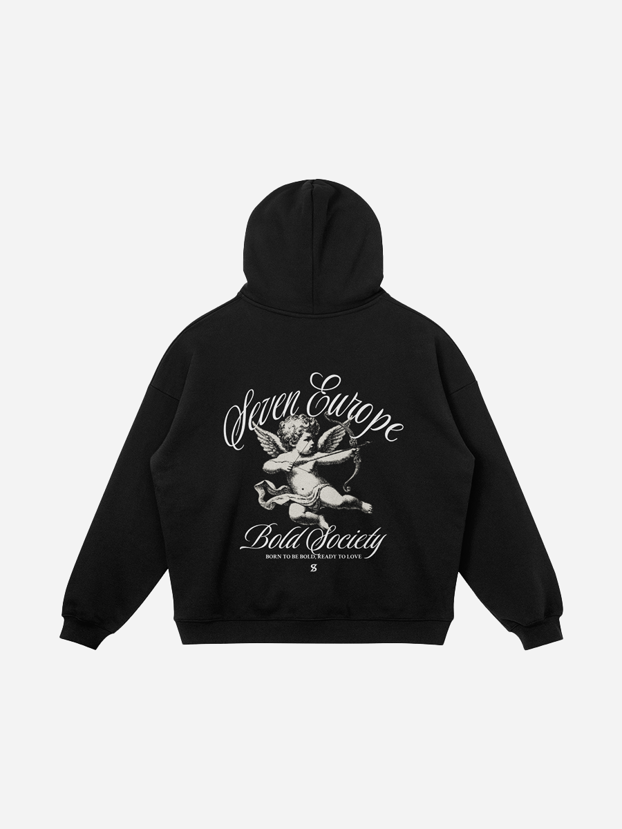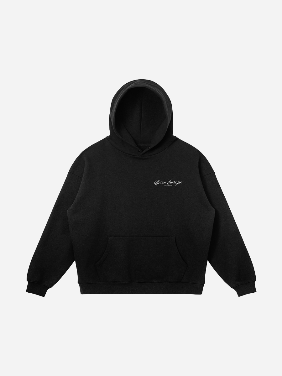 Introducing SEVEN READY TO LOVE HOODIE - BLACK Crafted from soft 380GSM combed cotton, this oversized hoodie blends warmth with style. The fleece lining and snap button collar provide extra protection, making it perfect for cooler days.